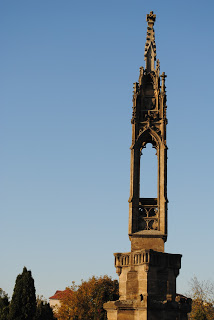 Ce caută el aici, înconjurat de morminte si cruci? Probabil, nimeni nu are răspunsul( nici măcar primarul:” nu am timp de coloane, sunt ocupat cu organizarea Consiliului Local.” ). Pentru ca cineva să ajungă la el, are de ales: ori sare de pe un mormânt pe altul şi se luptă cu tufişurile de spini, ori renunţă.Noi am reusit până la urmă să trecem de obstacole si  să ajungem cât mai aproape de el, ce am văzut este greu de închipuit. Într-un stil neogotic, având o înălţime de 20 de metri, stătea “singura si trista” operă de arta a arhitectului Josef  Kranner, cunoscută sub numele de Coloana Victoriei. Privind această construcţie, ochii îţi rămân “suspendaţi” asupra piedestalului construit odată asemenea unei cetăţi. Cetatea are acum imaginea unei cazarme care a ajutat soldaţii în timpul unui război, ocrotindu-i de bombe şi focuri de armă. Acest monument a fost ridicat în memoria apărătorilor oraşului ce şi-au pierdut viaţa în timpul asediului din anii 1848-1849. Din această construcţie se înalţă un baldachin, sprijinit pe patru coloane zvelte. În mijloc a mai rămas doar un loc bântuit de stafia Fidelităţii, care îşi mai cautăşi azi cheile oraşului. De jur împrejur se aflau patru statui ceva mai mici: Cinstea, Supunerea, Veghea şi Sacrificiul, care s-au pierdut fără urmă.